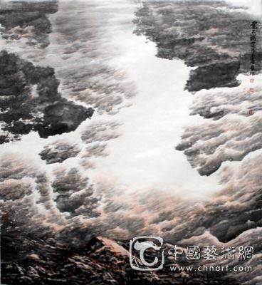 云海山水画的艺术特质:传统山水画着重表现的是大自然的山川、江河、树木、屋宇等景物,对大自然中的云彩是以留出空白来处理,或画山为主、画云为辅。而用“云法造境”创作方式构建的“云海山水画”却相反,它以云彩的升腾屈伸、吞吐天地间的气度神韵来统领画面的主旋律,将山川、江河、树木、屋宇等物体作为构成画面的陪衬或辅助的客体,使其协调、统一地融入于画面的整体艺术效果之中。同时通过提炼出的多种不同的画云技法的提升、强化、烘托,来凸显张扬大自然的运动美感,开拓一片大自然与人生浑然一体的情景境界,创造出具有新的内涵和意境的艺术新样式。