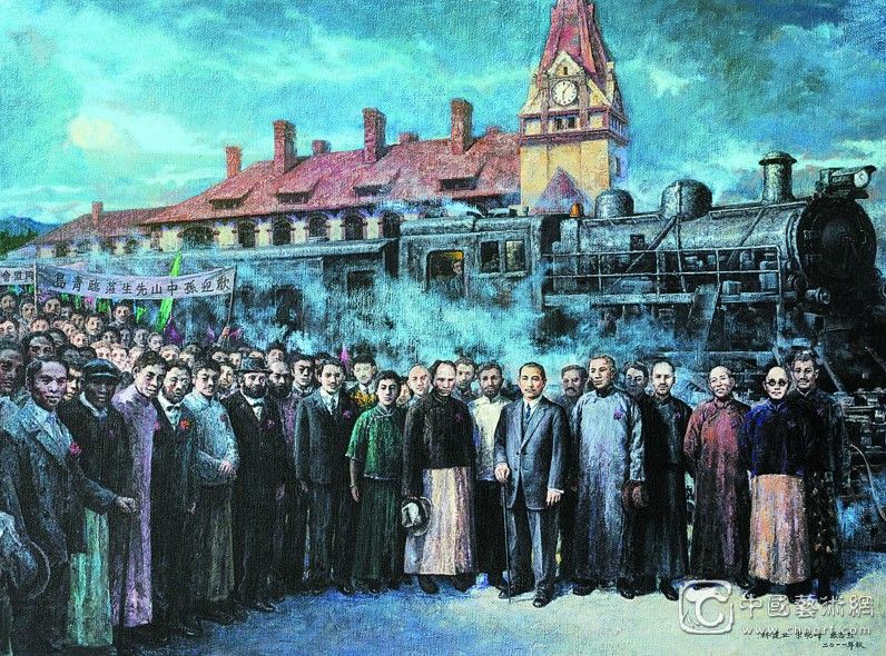 特别他创作的《孙中山来青岛》是幅大制作,他与助手精心准备,并聘请文史专家王铎做顾问,作品反映了当年孙中山考察胶济铁路的情景:低沉的天空,背景上的德式建筑和蒸汽机车头,孙中山先生在欢迎的人群簇拥下安然而立,构图平和,笔触自然,平中见奇,是历史题材的成功之作。