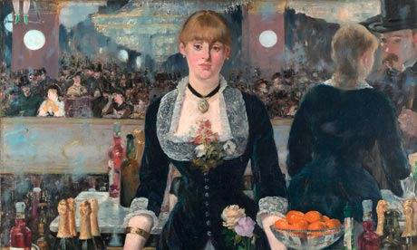 酒宴狂欢者比比皆是,在马奈的19世纪的杰作《快乐女神游乐场酒吧》(A Bar at the Folies-Bergère ),画中能够瞥见女招待身后镜子中反射的酒吧。昏暗的酒吧女招待,她独自柜台后,看着那些沉溺的人 们纵情声色,周围是一瓶瓶的巴斯啤酒,香槟和鸡尾酒等等。马奈描画了一个喧闹复杂的城市背景下现代 酒吧的场景:他既不是批判也不是庆祝。