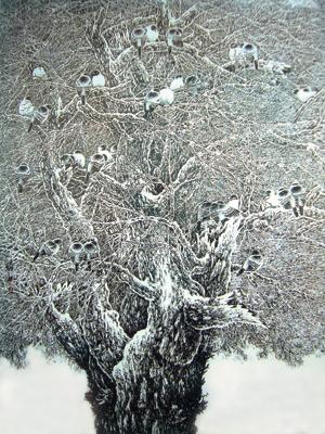 他获“2008造型艺术新人展”提名奖的作品《暖冬思语》(见附图上者)绘寒冬的夕阳下,一群小鸟与树木低语的情景,诉说着自然与生命的哲思,给人一种清新、宁静的感觉。这恰好吻合这次展览的主题———“探索·创新———造型艺术在现代社会中的民族性与地域性”。有一年他回老家过年,天寒地冻,行人稀少,只有落叶飘零、寒鸦鸣啼。一片白云悄悄越过苍茫的山坡,渐渐地如一股清泉,无声地漫入心扉。眼前的景物,让他凝神静思。往日零碎的构思慢慢成形,一幅图画浮现在脑中。他把昔日铺天盖地、掩映无数雀鸟的绿叶演绎为叶儿落尽、鸟儿在枝头窃窃私语。这由点、线、面组成的单纯的画面,于纯净中透出温暖,他因此叫它“暖冬思语”。