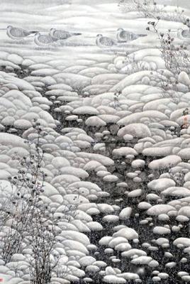 他的另一幅以鸟为题材的作品《北方十月》(见附图下者)描绘了深秋的北方雪景。画面上,雪花还在簌簌地飘着,河中的鹅卵石已经铺上层层雪花,野草坚韧地飘摇在小河旁,几只禽鸟在雪地里悠闲地踱着步子。整幅画自然、单纯,有生活情趣,使人有身临其境之感。作品体现了作者与自然界中生命的感情交流。有生命的事物,首先是以外在的朴素美感而唤起他的关注。它们内在的、具有“人格化”的深层美感,构成他与事物的感情上的共鸣,从而产生创作欲望和艺术灵感。