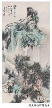 张大千尽管以临摹石涛著称,事实上又不止于石涛一家,还泛涉众家。渐江、石谿、“八大”、梅清、“四王”以外的各个画派,他无所不能,也无不可以乱真,并加以融会贯通。这些画派的画风,在他画作中都能见到。